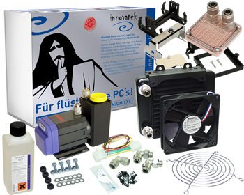 A range of professional kits which include CPU waterblock(s) and clamp(s), 12V water pump, header tank, 120 mm radiator, fan and grille, protection fluid, flexible pump mountings, thermal compound, connectors, cables and sundry connectors and fixings. You need only add distilled water.